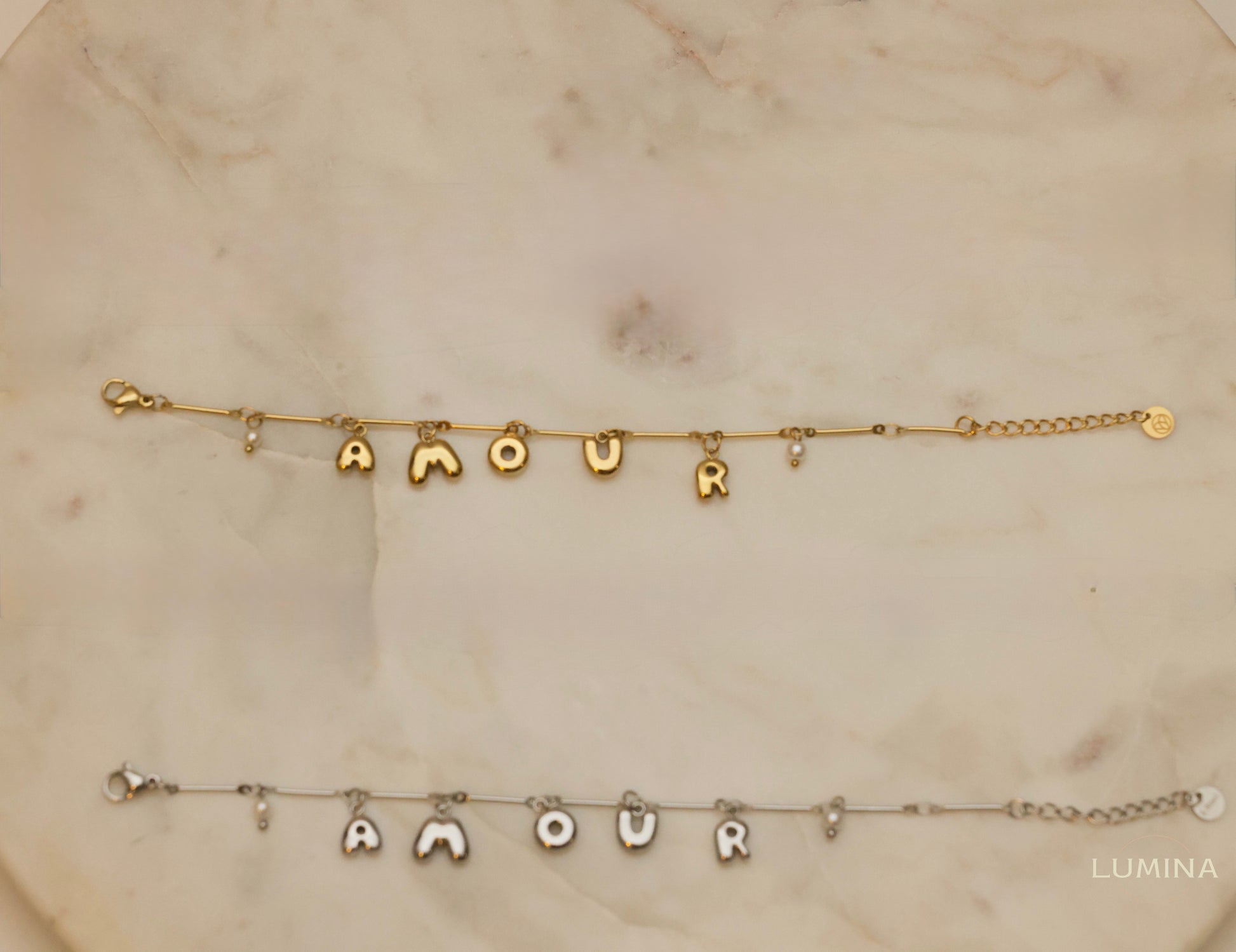 Le bracelet APHRODITE célèbre la tendresse et l'élégance. Orné de lettres formant le mot AMOUR et de délicates perles, il incarne la douceur des sentiments et la beauté des détails.